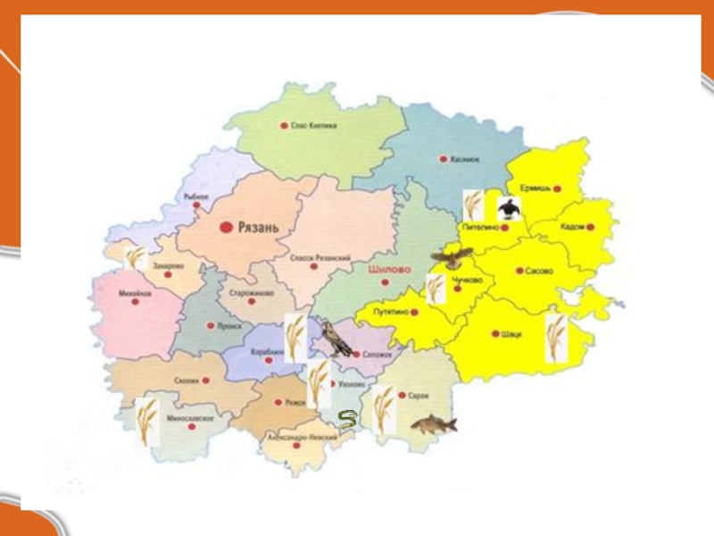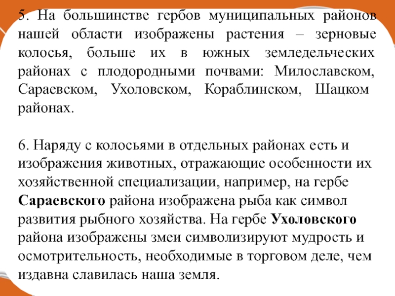 6. Наряду с колосьями в отдельных районах есть и изображения животных, отражающие особенности их хозяйственной специализации, например, на гербе Сараевского района изображена рыба как символ развития рыбного хозяйства. На гербе Ухоловского района изображены змеи символизируют мудрость и осмотрительность, необходимые в торговом деле, чем издавна славилась наша земля.