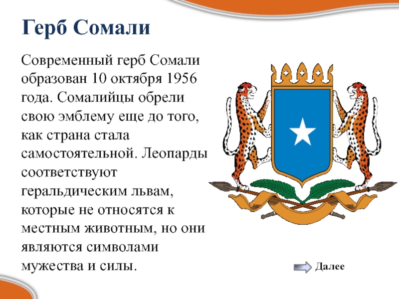 Современный герб Сомали образован 10 октября 1956 года. Сомалийцы обрели