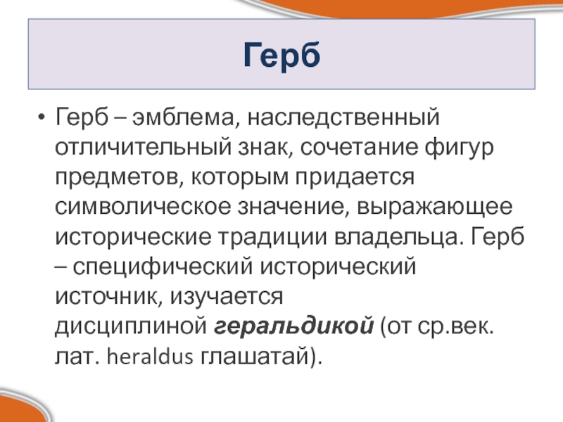 символическое значение, выражающее исторические традиции владельца. Герб – специфический исторический источник, изучается дисциплиной геральдикой (от ср.век. лат. heraldus глашатай).