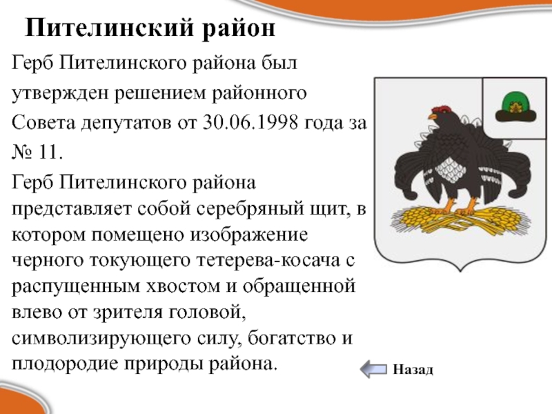 Герб Пителинского района был утвержден решением районного Совета депутатов от
