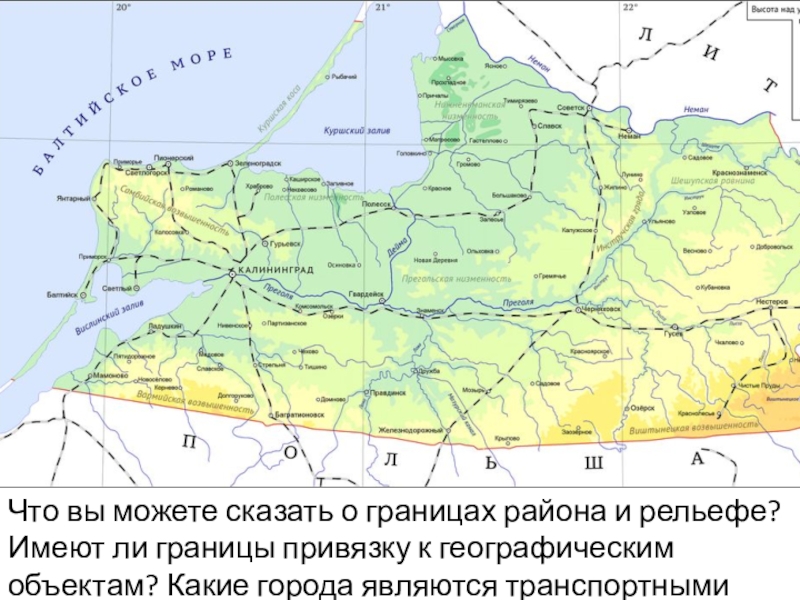 Слайд 6Что вы можете сказать о границах района и рельефе?