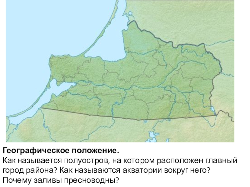 Географическое положение. Как называется полуостров, на котором расположен главный город района? Как называются акватории вокруг него? Почему