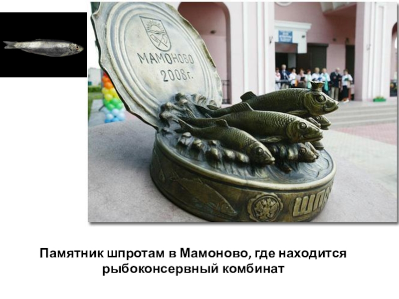 Слайд 8Памятник шпротам в Мамоново, где находится рыбоконсервный комбинат