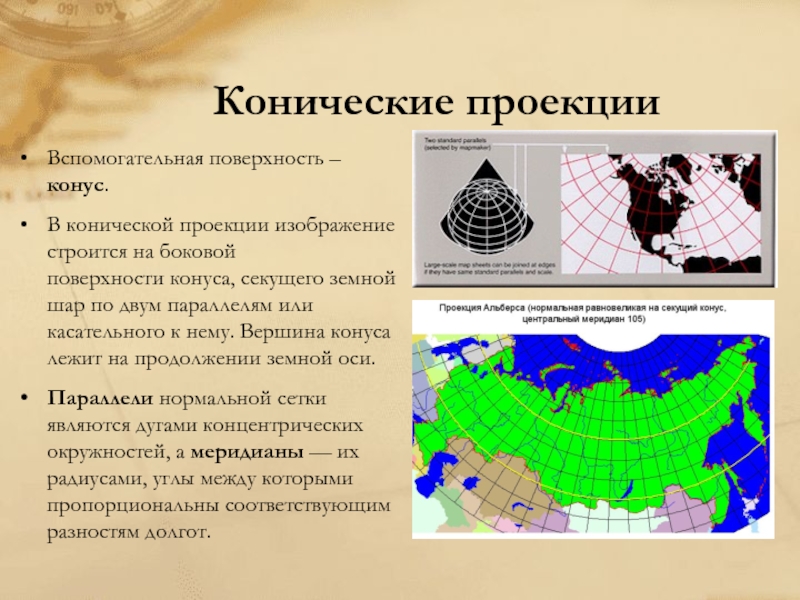 поверхности конуса, секущего земной шар по двум параллелям или касательного к нему. Вершина конуса лежит на продолжении земной оси.