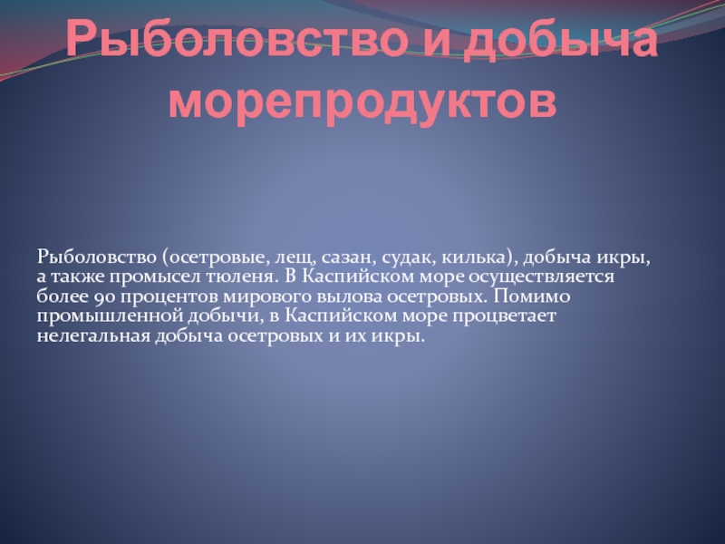 а также промысел тюленя. В Каспийском море осуществляется более 90 процентов мирового вылова осетровых. Помимо промышленной добычи, в Каспийском море процветает нелегальная добыча осетровых и их икры.