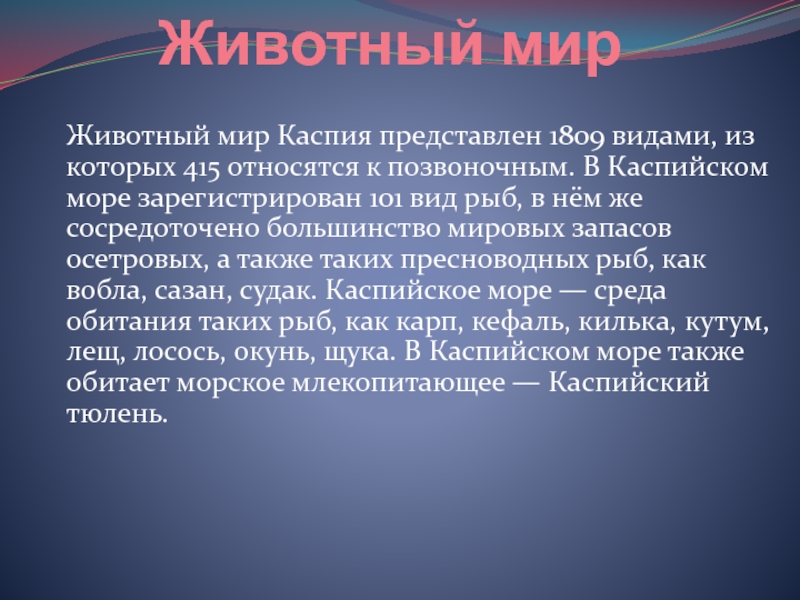 Животный мир Каспия представлен 1809 видами, из которых 415 относятся