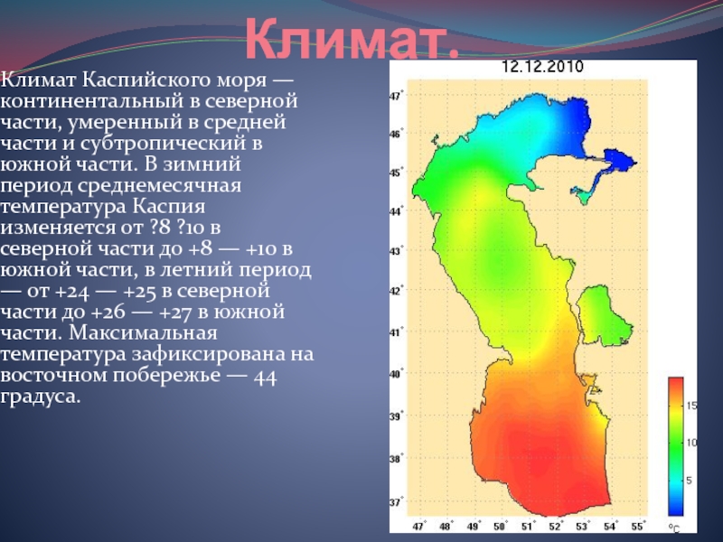 части и субтропический в южной части. В зимний период среднемесячная температура Каспия изменяется от ?8 ?10 в северной части до +8 — +10 в южной части, в летний период — от +24 — +25 в северной части до +26 — +27 в южной части. Максимальная температура зафиксирована на восточном побережье — 44 градуса.