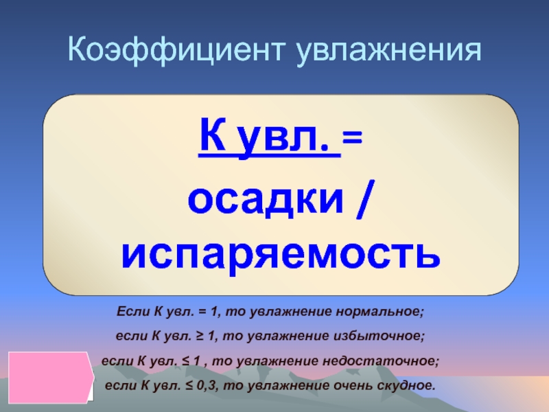 Коэффициент увлажненияК увл. = осадки / испаряемостьЕсли К увл. = 1, то увлажнение нормальное;если К увл. ≥
