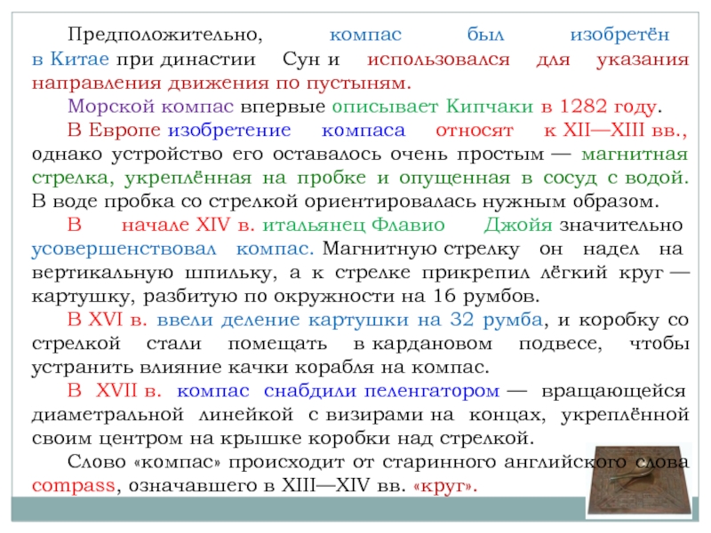Предположительно, компас был изобретён в Китае при династии Сун и использовался для указания направления движения по пустыням. 	Морской компас впервые описывает Кипчаки в 1282