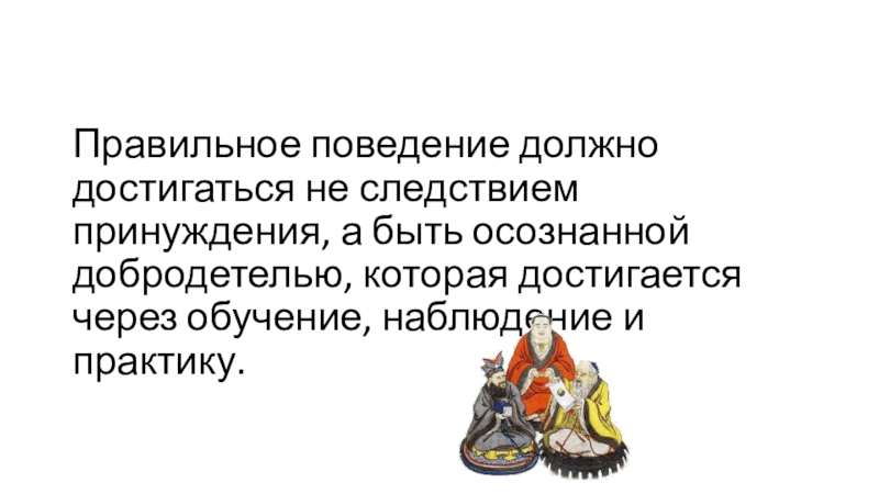 Слайд 15Правильное поведение должно достигаться не следствием принуждения, а быть осознанной добродетелью,