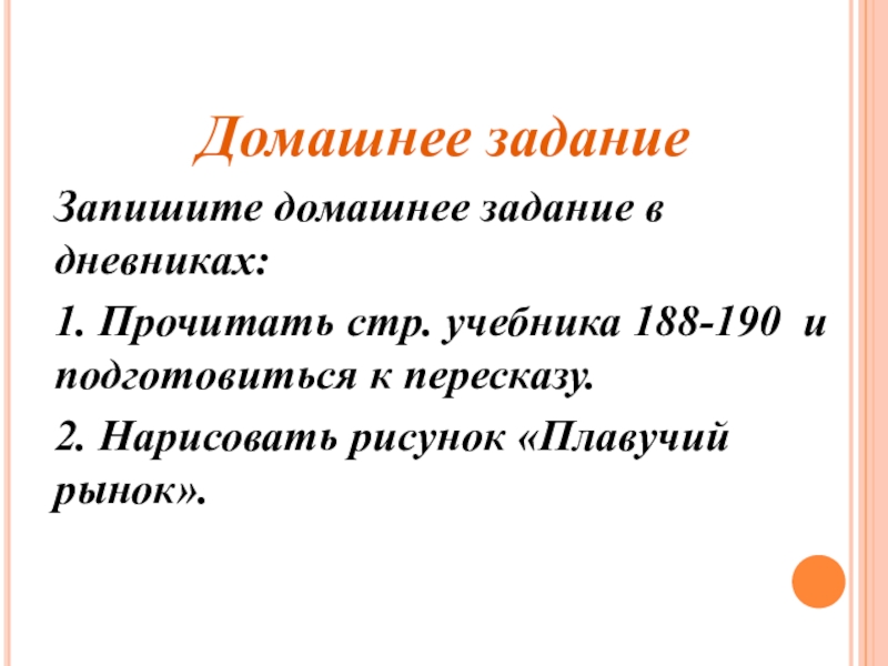 Домашнее заданиеЗапишите домашнее задание в дневниках:1. Прочитать стр. учебника 188-190 и подготовиться к пересказу.2. Нарисовать рисунок «Плавучий