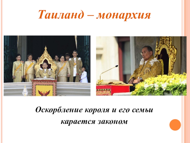 Таиланд – монархияОскорбление короля и его семьи карается законом