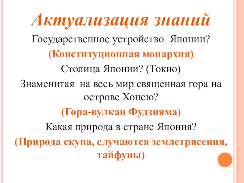 Актуализация знанийГосударственное устройство Японии?(Конституционная монархия)Столица Японии? (Токио)Знаменитая на весь мир священная гора на острове Хонсю? (Гора-вулкан Фудзияма)Какая природа в стране Япония? (Природа скупа, случаются землетрясения, тайфуны)