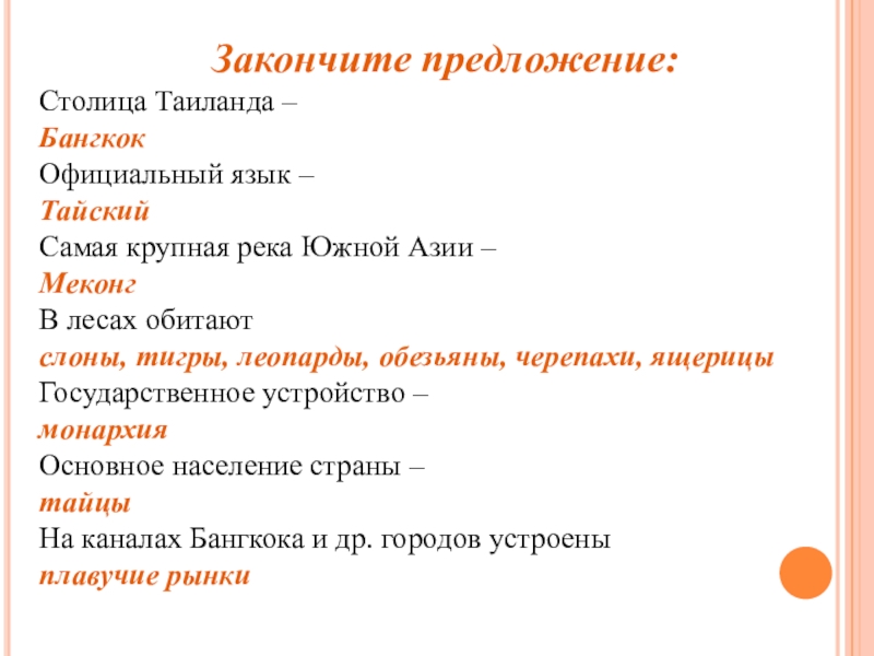 Закончите предложение:Столица Таиланда – Бангкок Официальный язык – ТайскийСамая крупная река Южной Азии –
