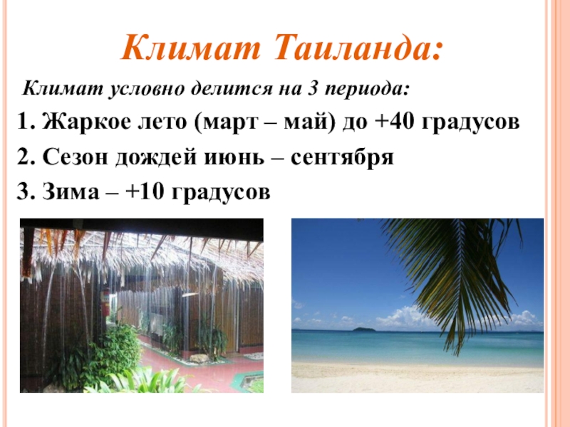 Климат Таиланда: Климат условно делится на 3 периода: 1. Жаркое лето (март – май) до +40 градусов2.
