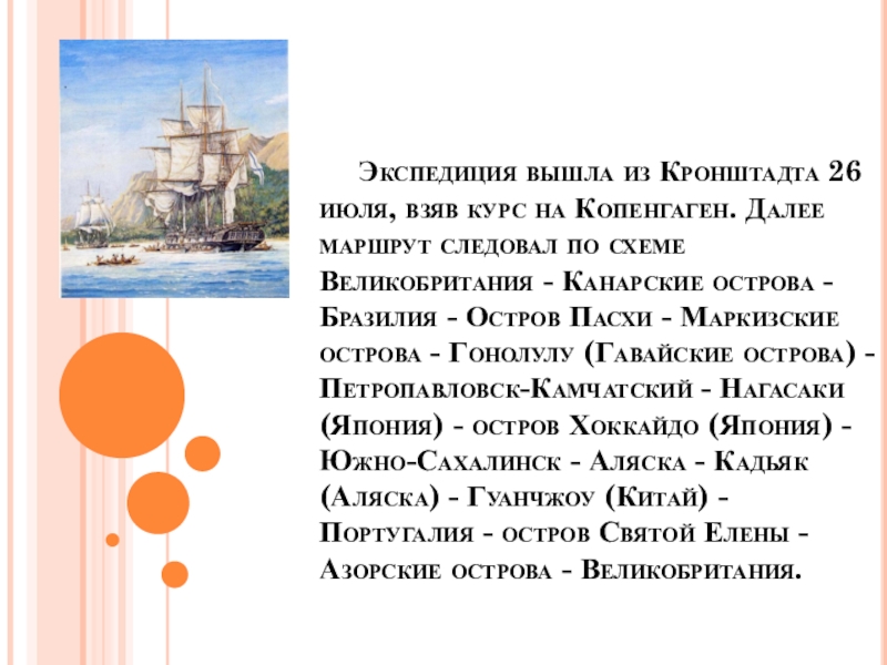 Слайд 7 Экспедиция вышла из Кронштадта 26 июля, взяв курс на Копенгаген. Далее
