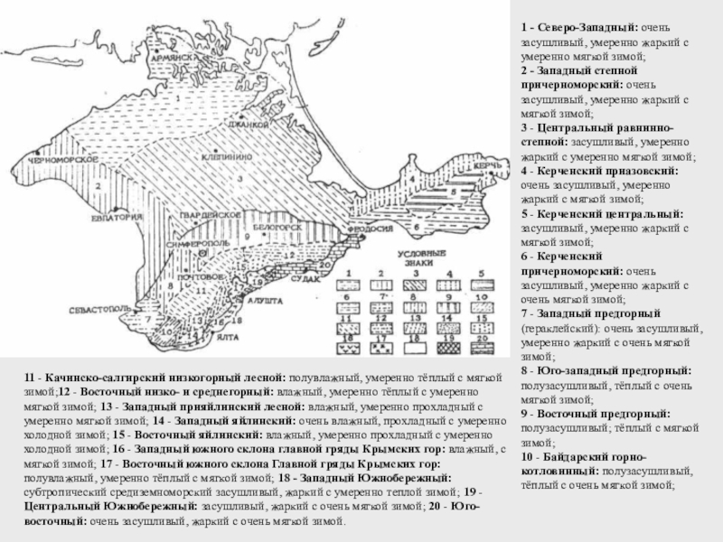 11 - Качинско-салгирский низкогорный лесной: полувлажный, умеренно тёплый с мягкой зимой;12 - Восточный низко- и среднегорный: влажный, умеренно тёплый с умеренно мягкой зимой; 13 - Западный прияйлинский лесной: влажный, умеренно прохладный с умеренно мягкой зимой; 14 - Западный яйлинский: очень влажный, прохладный с умеренно холодной зимой; 15 - Восточный яйлинский: влажный, умеренно прохладный с умеренно холодной зимой; 16 - Западный южного склона главной гряды Крымских гор: влажный, с мягкой зимой; 17 - Восточный южного склона Главной гряды Крымских гор: полувлажный, умеренно тёплый с мягкой зимой; 18 - Западный Южнобережный: субтропический средиземноморский засушливый, жаркий с умеренно теплой зимой; 19 - Центральный Южнобережный: засушливый, жаркий с очень мягкой зимой; 20 - Юго-восточный: очень засушливый, жаркий с очень мягкой зимой.