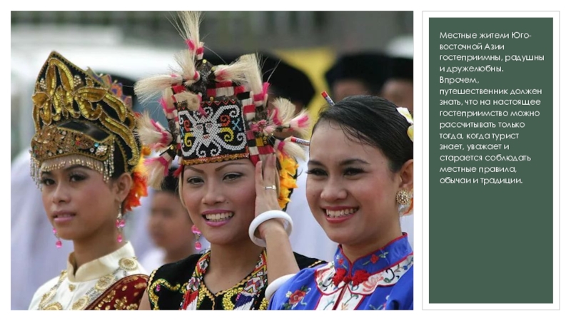 Слайд 2Местные жители Юго-восточной Азии гостеприимны, радушны и дружелюбны. Впрочем, путешественник должен
