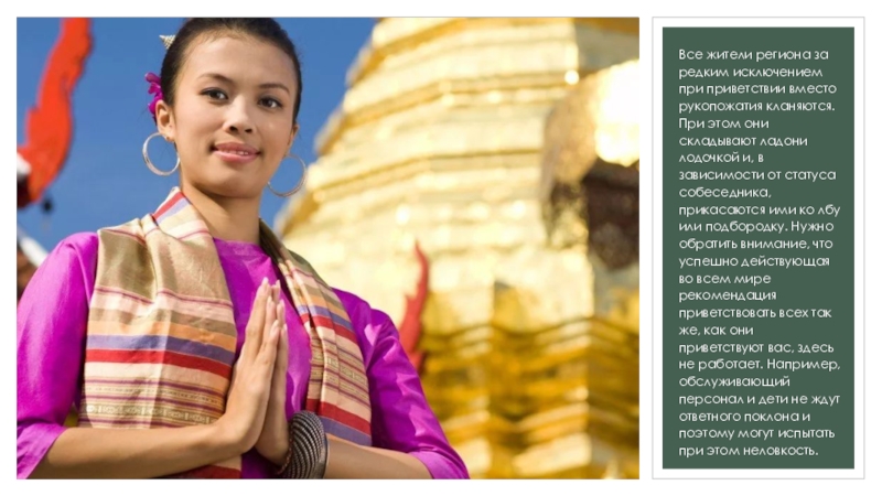 При этом они складывают ладони лодочкой и, в зависимости от статуса собеседника, прикасаются ими ко лбу или подбородку. Нужно обратить внимание, что успешно действующая во всем мире рекомендация приветствовать всех так же, как они приветствуют вас, здесь не работает. Например, обслуживающий персонал и дети не ждут ответного поклона и поэтому могут испытать при этом неловкость.