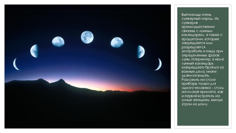 Слайд 8Вьетнамцы очень суеверный народ. Их суеверия преимущественно связаны с лунным календарем,