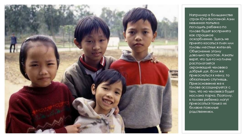 Слайд 3Например в большинстве стран Юго-Восточной Азии невинная попытка погладить ребенка по
