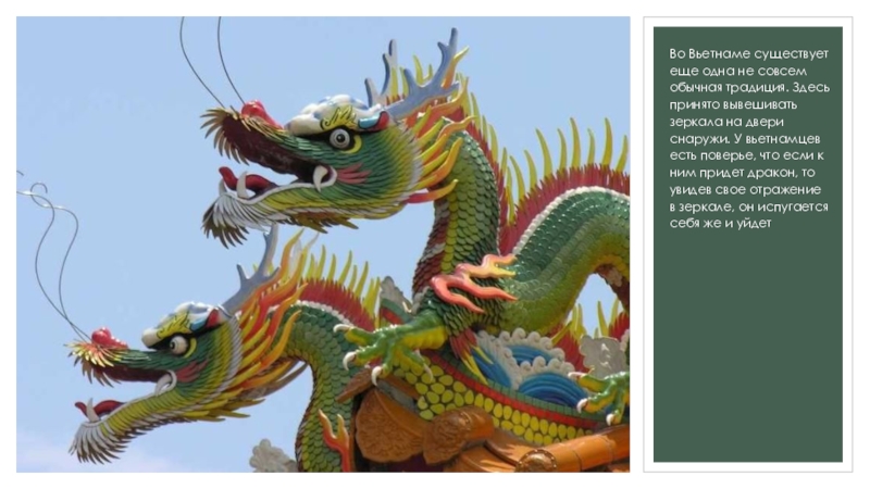 вывешивать зеркала на двери снаружи. У вьетнамцев есть поверье, что если к ним придет дракон, то увидев свое отражение в зеркале, он испугается себя же и уйдет