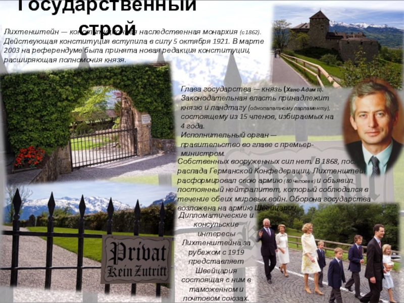 (нем. Fürstentum Liechtenstein карликовое (160 км2) государство в Центральной Европе. Название страны происходит от правящей династии Лихтенштей.