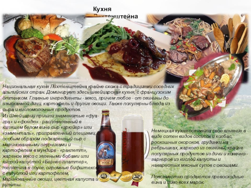 Из Швейцарии пришли знаменитые «фуа-гра» и «фондю» - расплавленный в кипящем белом вине сыр «грюйер» или «эмменталь», приправленный специями, особым образом поджаренный сыр с маринованными огурчиками и картофелем в мундире - «раклетт», жареное мясо с зелеными бобами или кислой капустой «Бернес-платтер», телятина в соусе, огромные бифштексы с капустой или картофелем, маринованные овощи, цветная капуста и рулеты.
