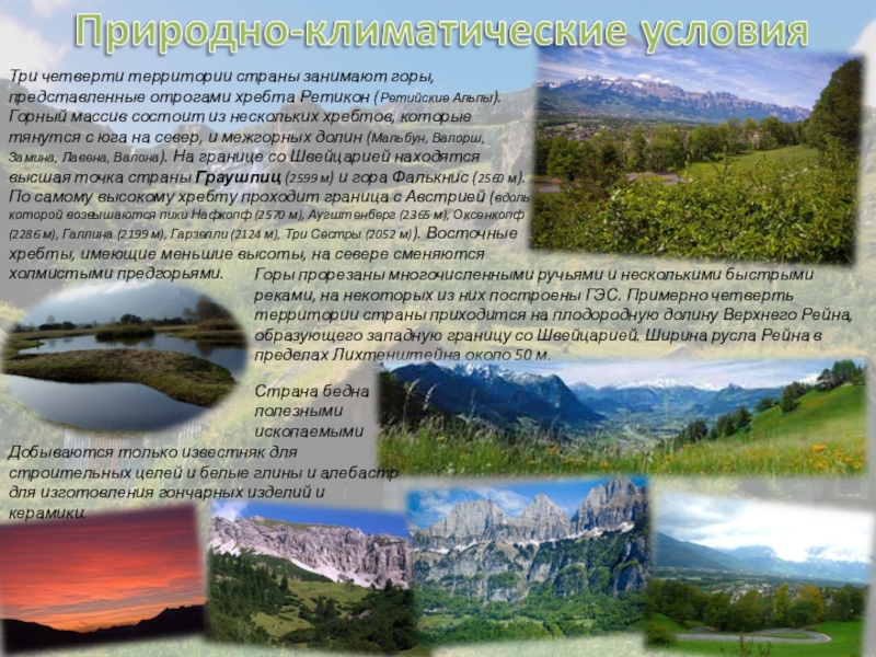 Три четверти территории страны занимают горы, представленные отрогами хребта Ретикон (Ретийские Альпы). Горный массив состоит из нескольких хребтов, которые тянутся с юга на север, и межгорных долин (Мальбун, Валорш, Замина, Лавена, Валона). На границе со Швейцарией находятся высшая точка страны Граушпиц (2599 м) и гора Фалькнис (2560 м). По самому высокому хребту проходит граница с Австрией (вдоль которой возвышаются пики Нафкопф (2570 м), Аугштенберг (2365 м), Оксенкопф (2286 м), Галлина (2199 м), Гарзелли (2124 м), Три Сестры (2052 м)). Восточные хребты, имеющие меньшие высоты, на севере сменяются холмистыми предгорьями.