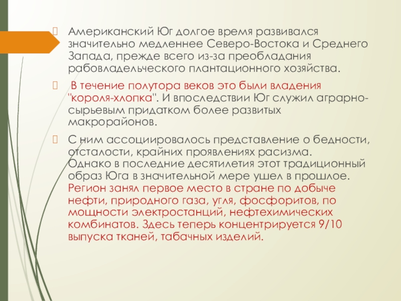 Слайд 25Американский Юг долгое время развивался значительно медленнее Северо-Востока и Среднего Запада,