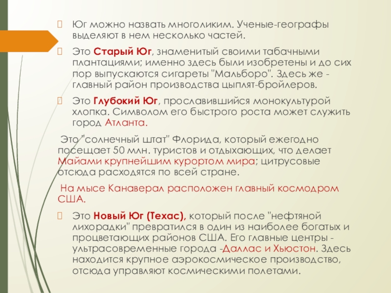 В течение полутора веков это были владения "короля-хлопка". И впоследствии Юг служил аграрно-сырьевым придатком более развитых макрорайонов.