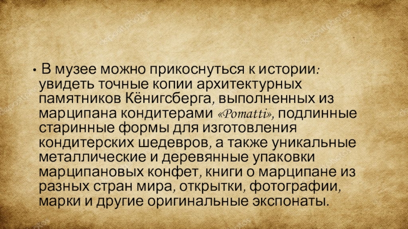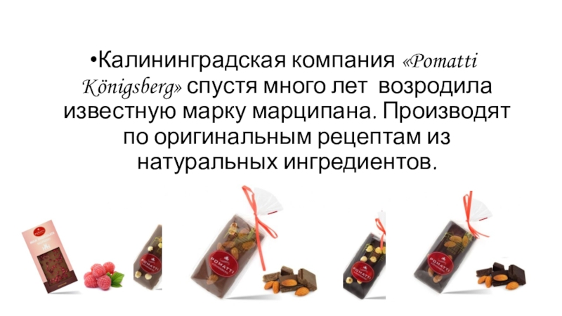 Слайд 7Калининградская компания «Pomatti Königsberg» спустя много лет возродила известную марку марципана.
