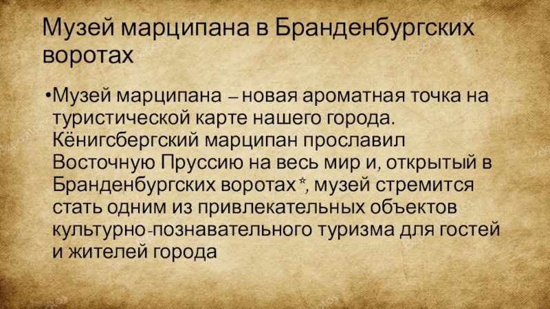 туристической карте нашего города. Кёнигсбергский марципан прославил Восточную Пруссию на весь мир и, открытый в Бранденбургских воротах*, музей стремится стать одним из привлекательных объектов культурно-познавательного туризма для гостей и жителей города