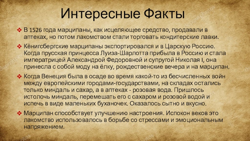 Интересные ФактыВ 1526 года марципаны, как исцеляющее средство, продавали в аптеках, но потом лакомством стали торговать кондитерские