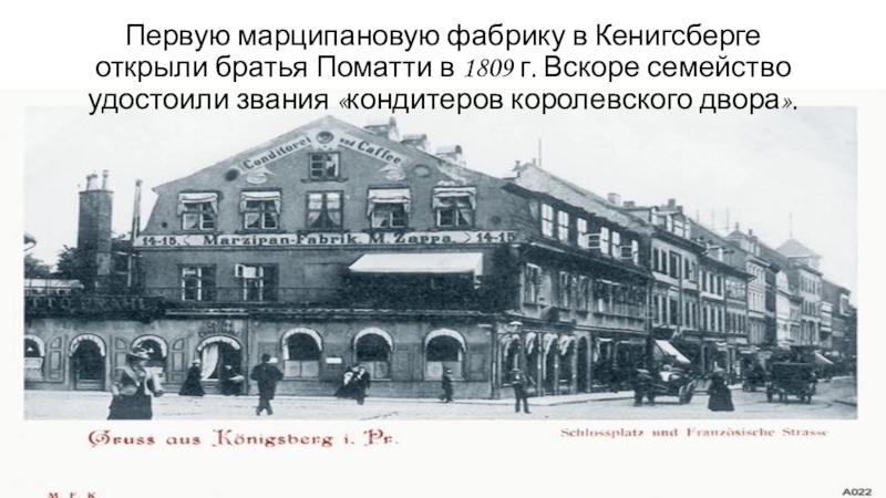 Первую марципановую фабрику в Кенигсберге открыли братья Поматти в 1809 г. Вскоре семейство удостоили звания «кондитеров королевского