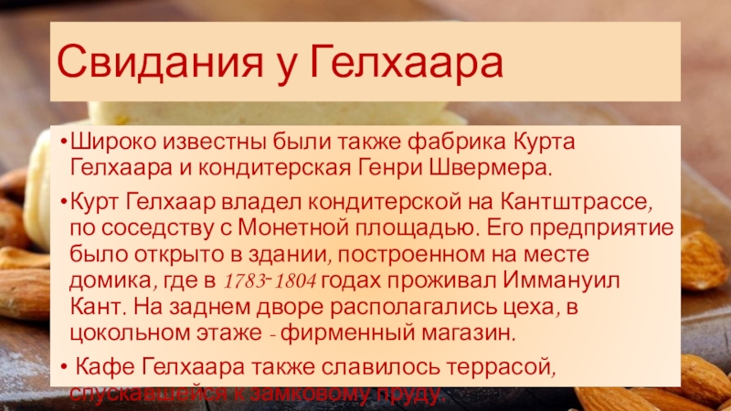 Курт Гелхаар владел кондитерской на Кантштрассе, по соседству с Монетной площадью. Его предприятие было открыто в здании, построенном на месте домика, где в 1783‑1804 годах проживал Иммануил Кант. На заднем дворе располагались цеха, в цокольном этаже - фирменный магазин.