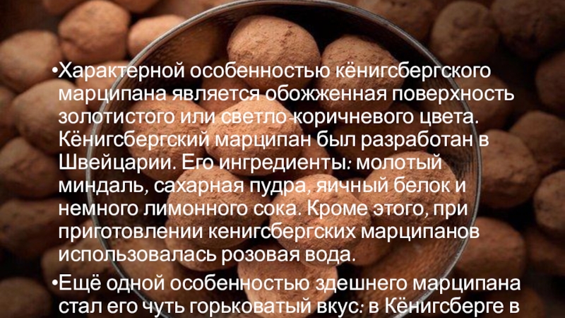 Слайд 3Характерной особенностью кёнигсбергского марципана является обожженная поверхность золотистого или светло-коричневого цвета.