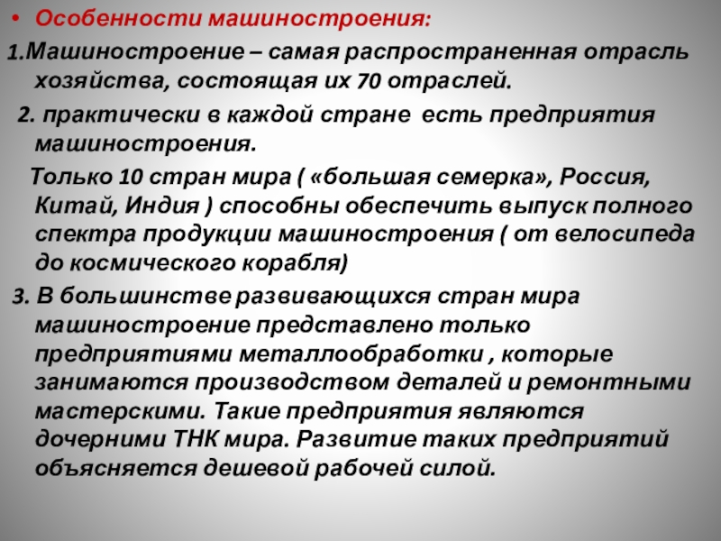 Только 10 стран мира ( «большая семерка», Россия, Китай, Индия ) способны обеспечить выпуск полного спектра продукции машиностроения ( от велосипеда до космического корабля)