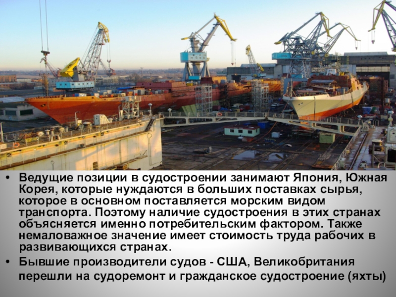 больших поставках сырья, которое в основном поставляется морским видом транспорта. Поэтому наличие судостроения в этих странах объясняется именно потребительским фактором. Также немаловажное значение имеет стоимость труда рабочих в развивающихся странах.