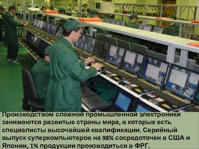 Слайд 17Производством сложной промышленной электроники занимаются развитые страны мира, в которых есть