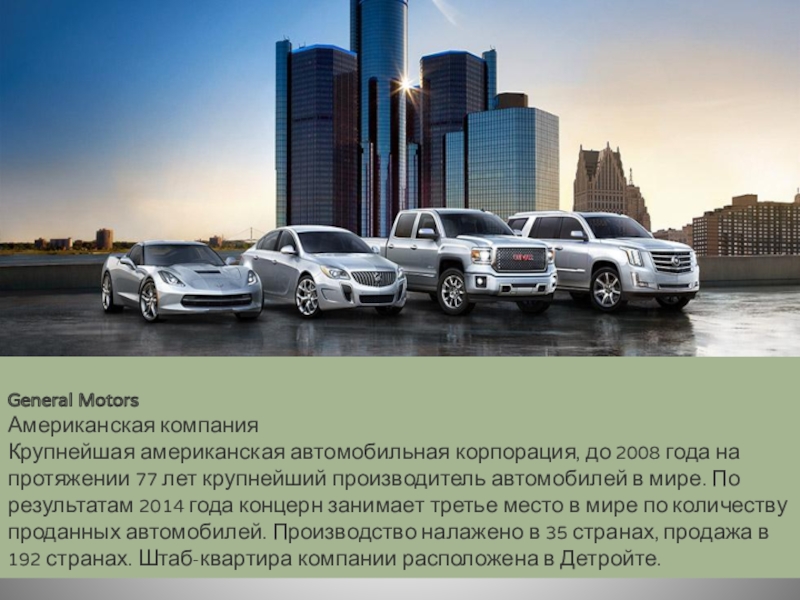 протяжении 77 лет крупнейший производитель автомобилей в мире. По результатам 2014 года концерн занимает третье место в мире по количеству проданных автомобилей. Производство налажено в 35 странах, продажа в 192 странах. Штаб-квартира компании расположена в Детройте.