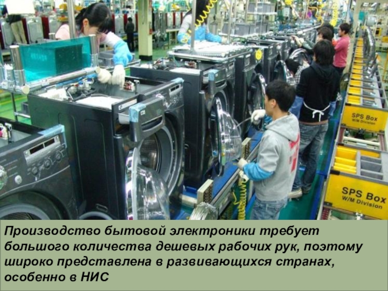Слайд 10Производство бытовой электроники требует большого количества дешевых рабочих рук, поэтому широко