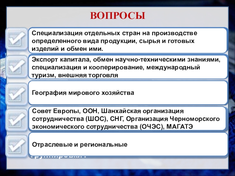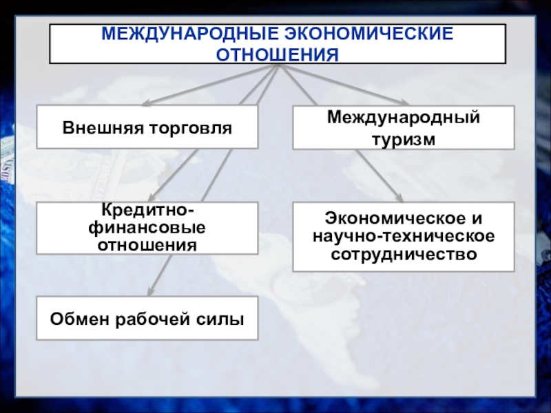Экспорт капитала, обмен научно-техническими знаниями, специализация и кооперирование, международный туризм, внешняя торговля