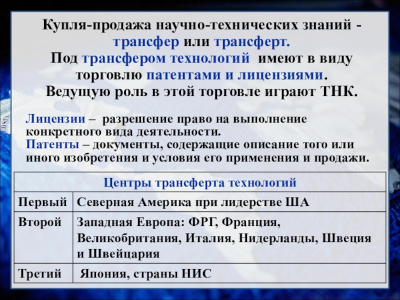 Международный обмен научно-техническими знаниями (патенты, лицензии)