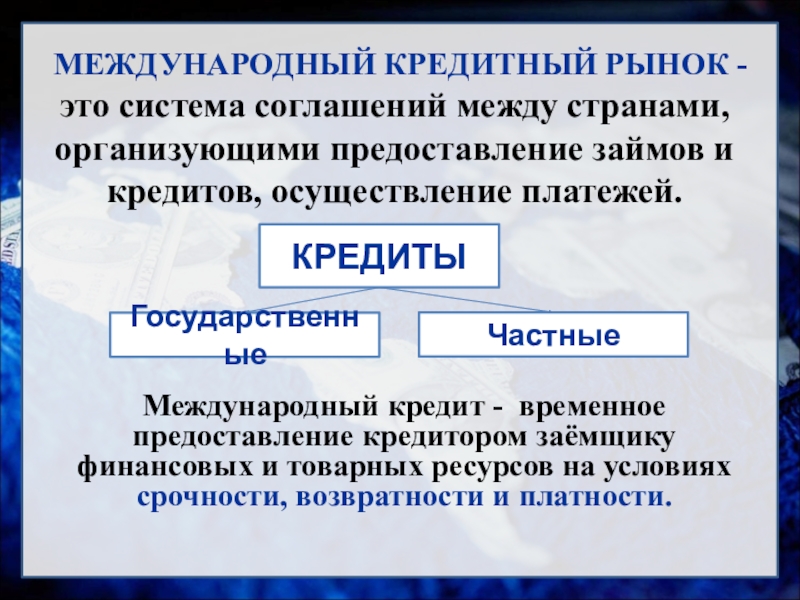 Международный кредит - временное предоставление кредитором заёмщику финансовых и товарных ресурсов на условиях