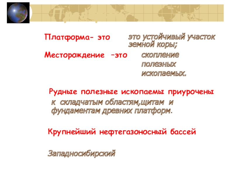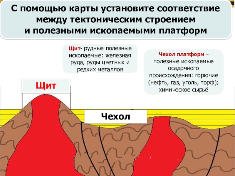 Чехол платформ – полезные ископаемые осадочного происхождения: горючие (нефть, газ, уголь, торф); химическое сырьё