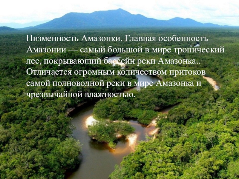 Слайд 17Низменность Амазонки. Главная особенность Амазонии — самый большой в мире тропический