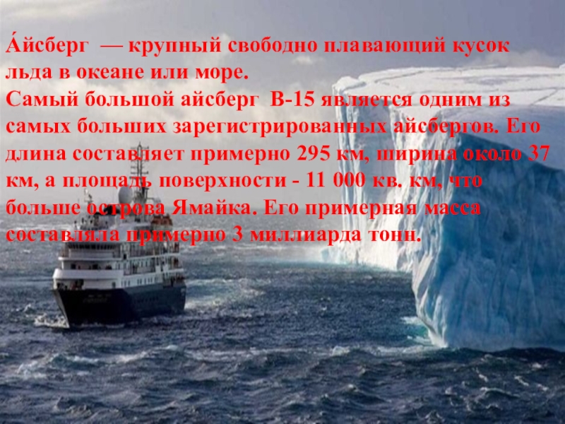 большой айсберг B-15 является одним из самых больших зарегистрированных айсбергов. Его длина составляет примерно 295 км, ширина около 37 км, а площадь поверхности - 11 000 кв. км, что больше острова Ямайка. Его примерная масса составляла примерно 3 миллиарда тонн.