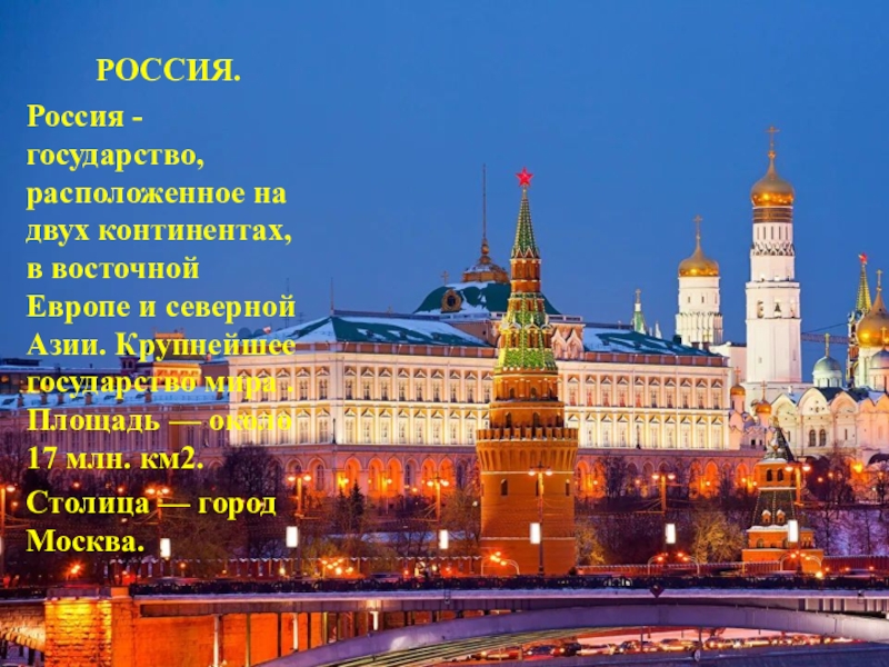 и северной Азии. Крупнейшее государство мира . Площадь — около 17 млн. км2.