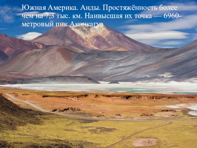 Слайд 16Южная Америка. Анды. Простяжённость более чем на 7,3 тыс. км. Наивысшая